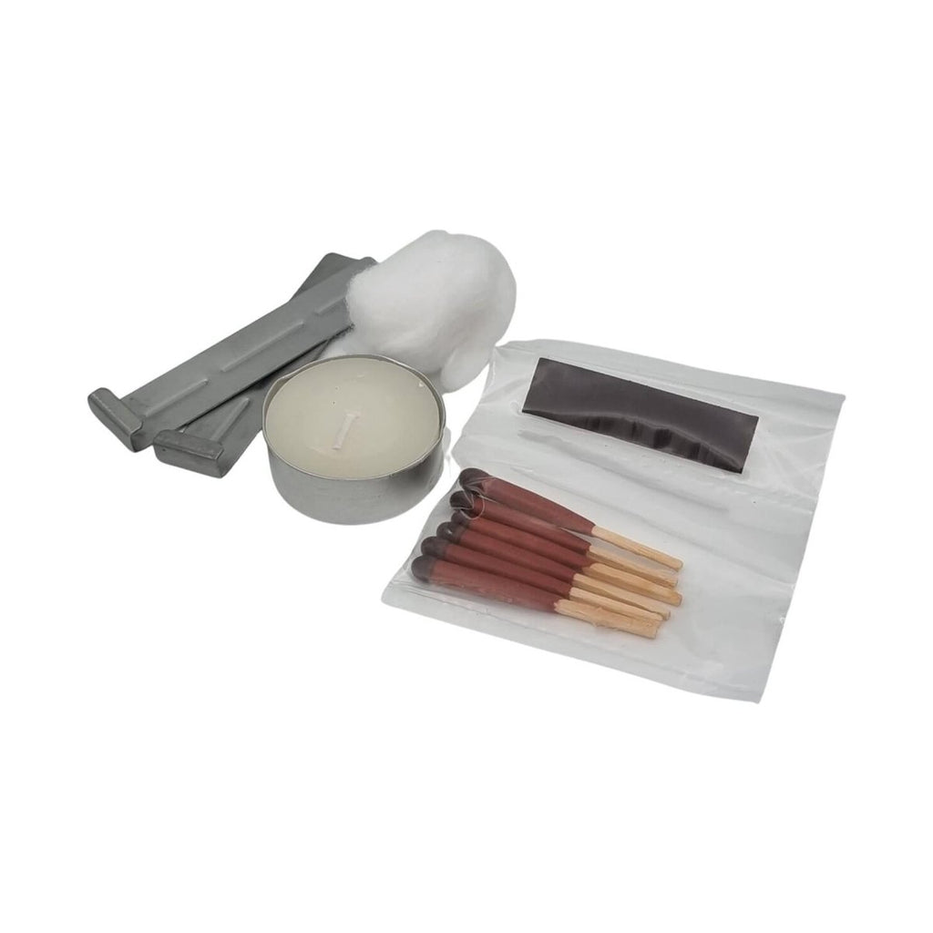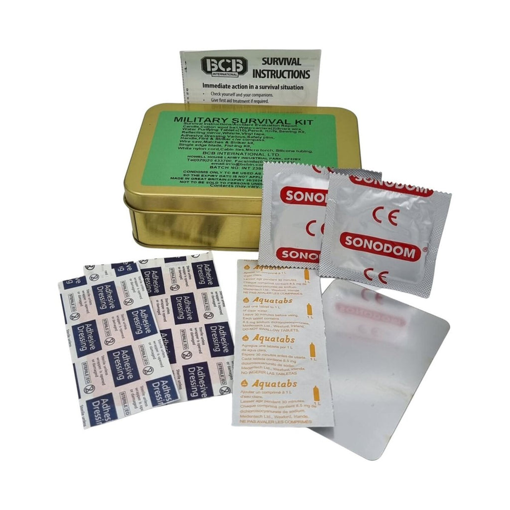 Set includes: water-resistant tin, vinyl tape, a lockable knife blade, waterproof matches & striker, pencil, water purification tablets, snare wire, nightlight candle, fireball flint & striker with button compass, fishing kit, distress whistle, sewing kit, safety pins, basic wire saw, signal mirror, tin hanging handle, led micro torch, tinder cotton balls, single-edged razors, adhesive sterile plasters, unlubricated condoms ( water carriers) survival instructions, accident evaluation form.