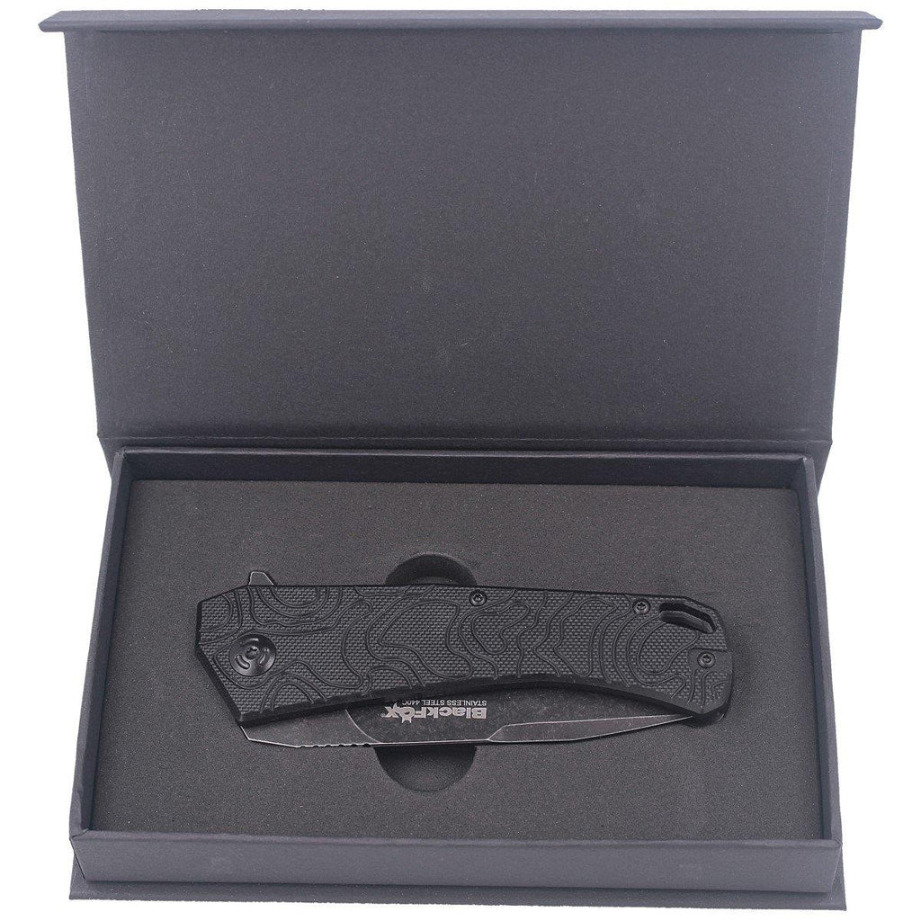• The knife features a 440C stainless steel blade with a hardness of HRC 57–59, ensuring long-lasting sharpness and strength. You can rely on its edge to cut cleanly and efficiently, even after heavy use. The black Idroglider stone wash coating enhances corrosion resistance and gives the knife a rugged, modern look.