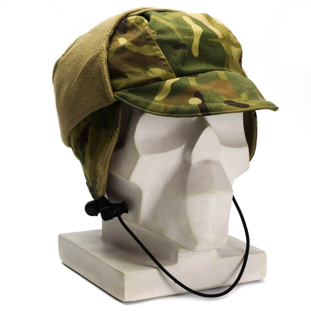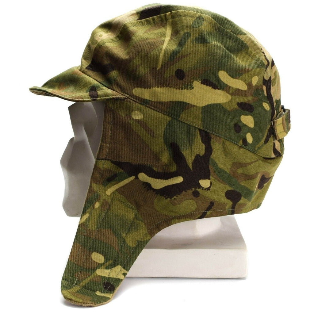 This is a British military waterproof paratrooper cap in Multi-Terrain Pattern (MTP) camouflage. It is designed to protect the head and keep the wearer dry in wet conditions. The cap is made in a classic paratrooper style and features the MTP camouflage pattern, which was developed to blend in with various terrains found in British military operations. The cap is designed for use by paratroopers and other military personnel, and is built to be both durable and practical for use in challenging environments.