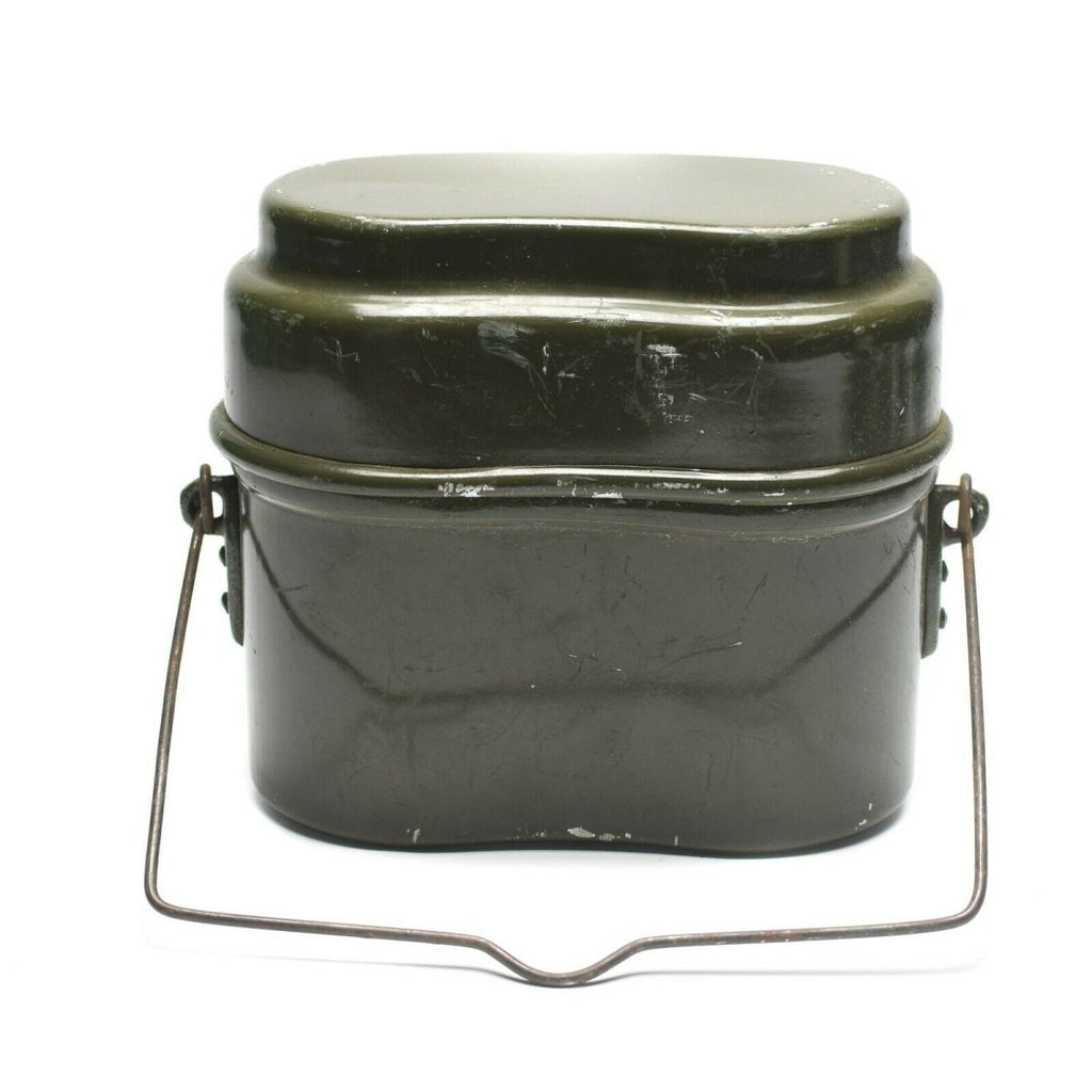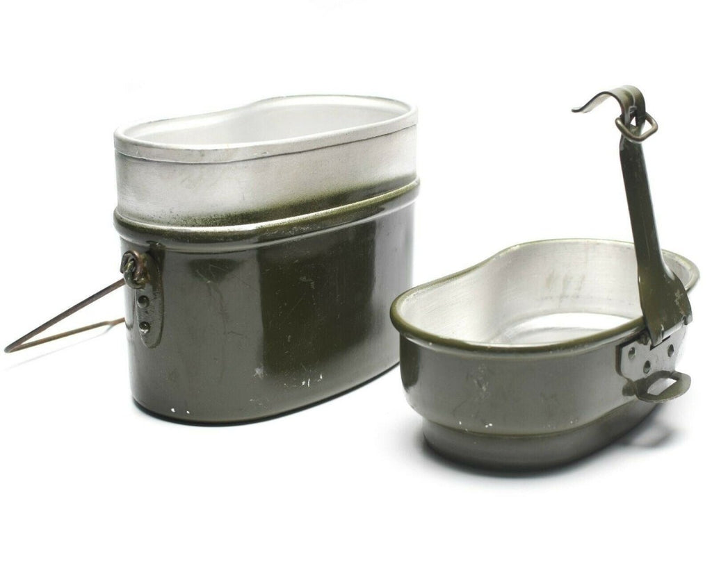 Introducing the vintage army mess kit, a nostalgic piece of military history blending functionality with vintage charm. This authentic aluminum bowler pot set, a true relic from the Hungarian Army. Is a unique addition to your collection or outdoor gear.