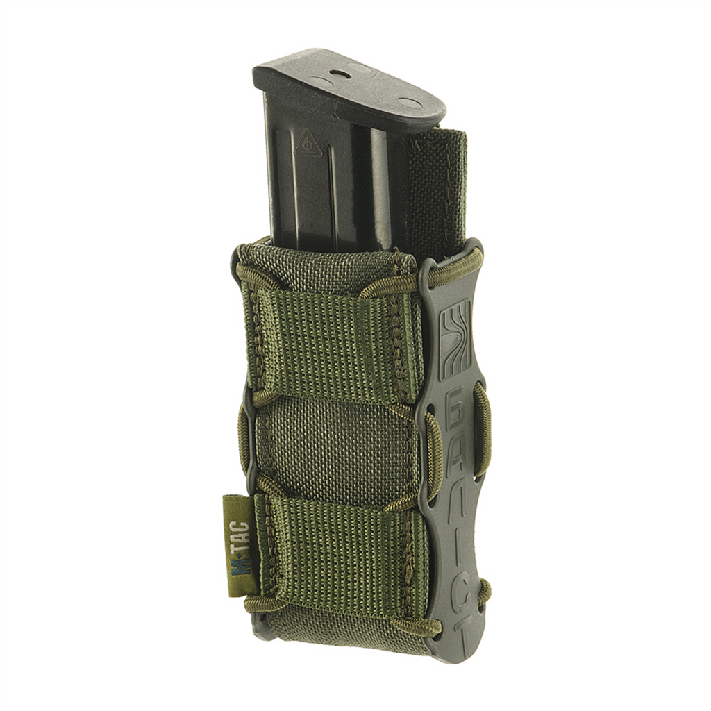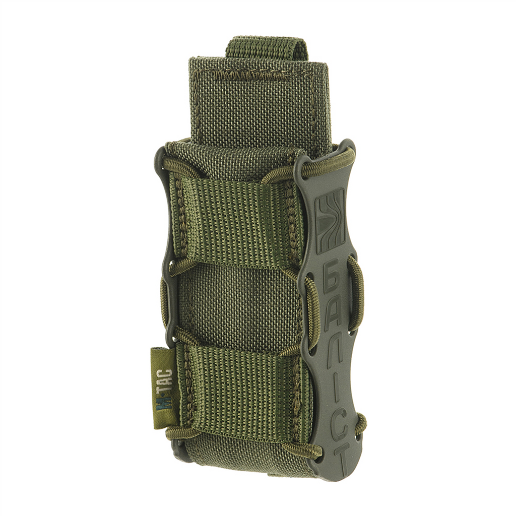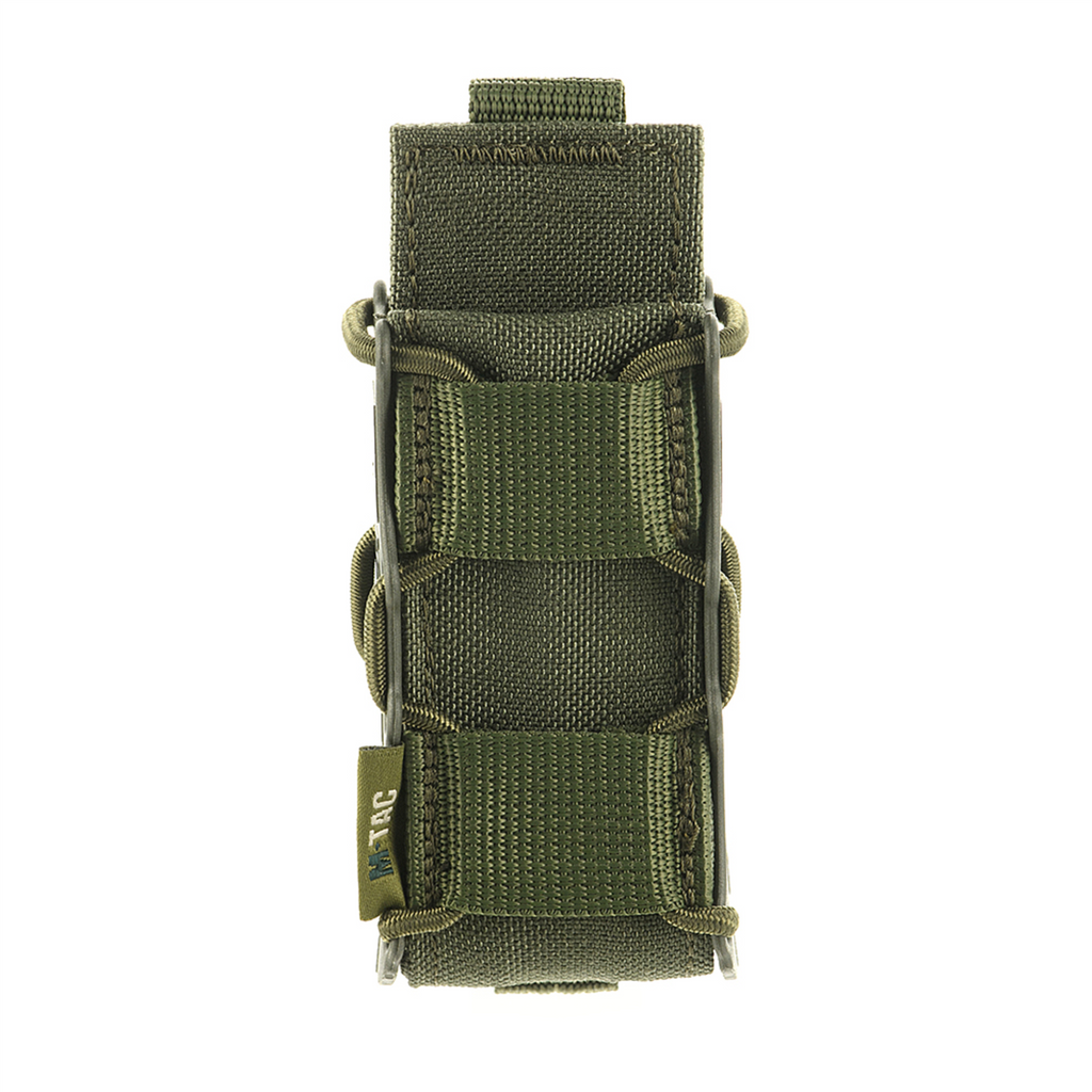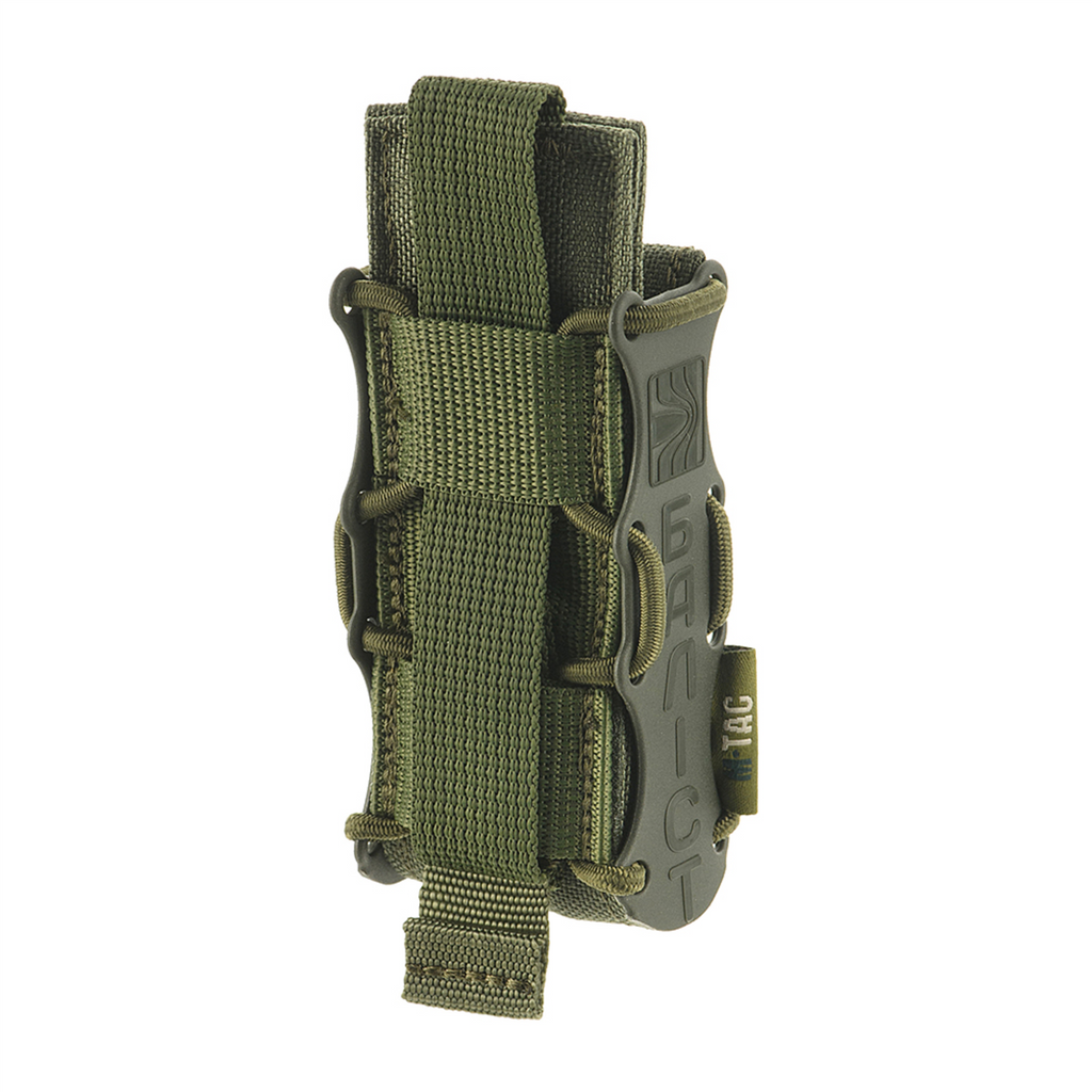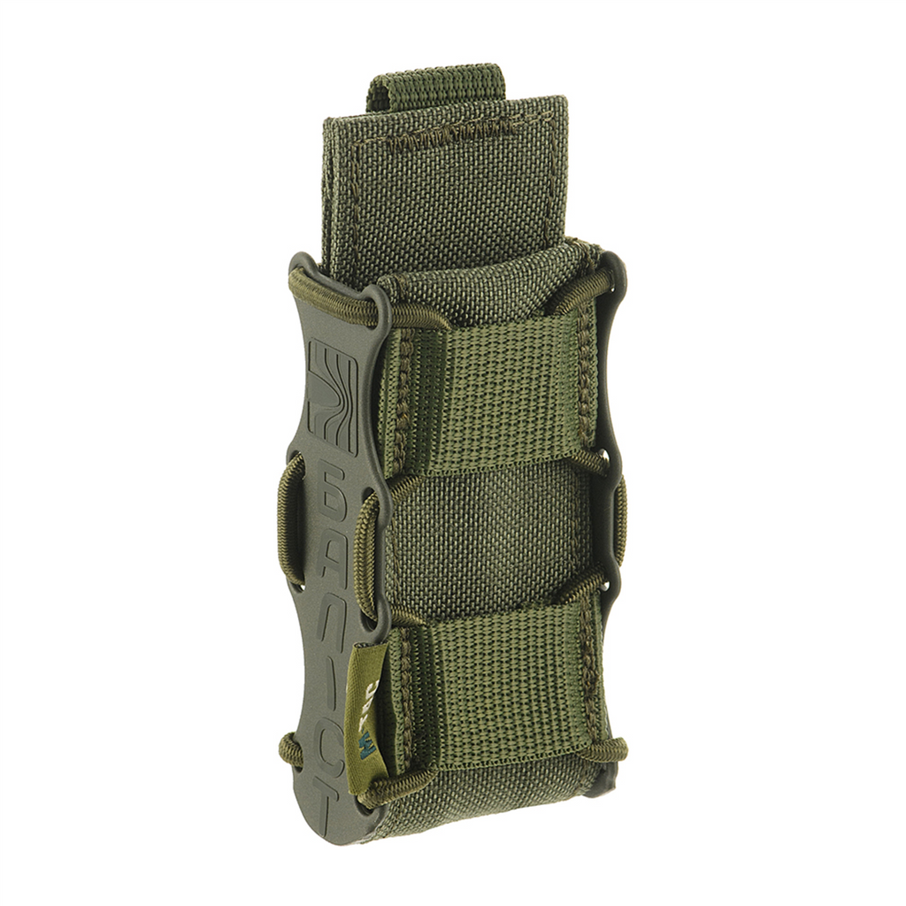 The pouch features a MOLLE attachment system, allowing secure mounting to tactical vests, plate carriers, belts, or backpacks equipped with MOLLE webbing. Its open top design with elastic retention ensures quick and easy access to the magazine while keeping it securely in place during movement.