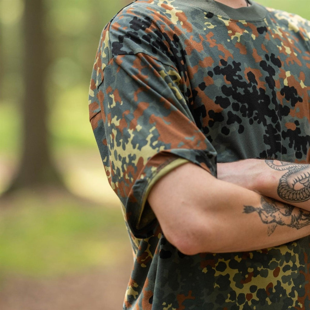 - The flecktarn pattern blends well with natural surroundings, making it suitable for outdoor excursions. Whether you're hiking, camping, or just enjoying a day in nature, this t-shirt will keep you comfortable and stylish. The military aesthetic adds a rugged touch that enhances your outdoor gear.