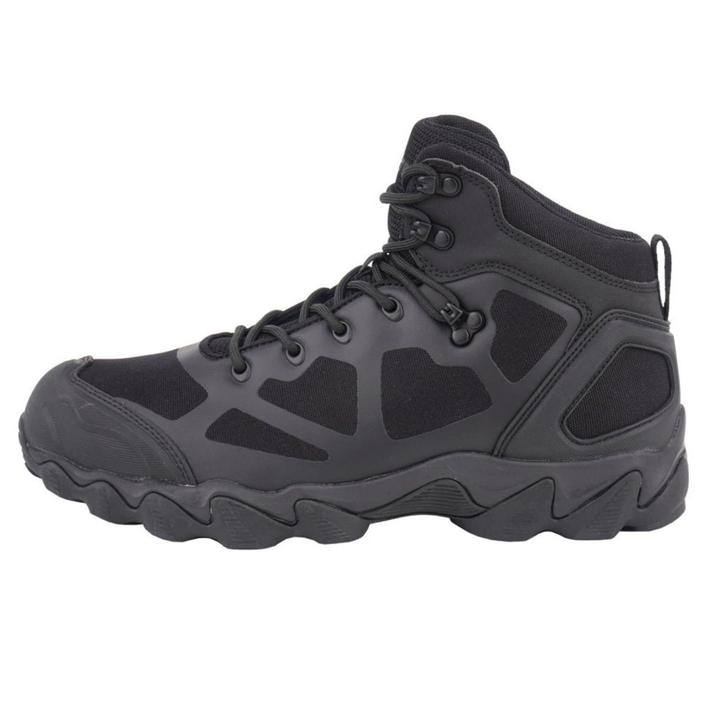 • These boots excel in hiking and seamlessly integrate features from both sports and military footwear. Their lightweight, breathable black fabric ensures versatility across diverse outdoor settings. Providing unmatched comfort and airflow.