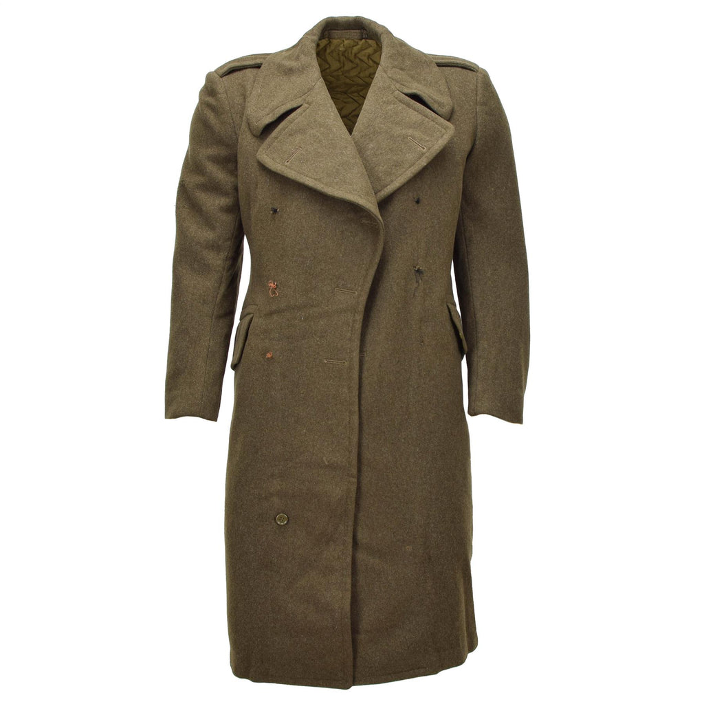 Authentic Canadian Army wool overcoat from original military surplus, grade B condition. This heavy-duty long coat was designed for officers and made from a thick wool blend to ensure warmth, durability, and timeless military style. It features a double-breasted front design, shoulder epaulettes, side pockets, and a quilted inner lining for added comfort in cold weather. Buttons are missing, which reflects its genuine surplus condition. The olive green color and structured cut represent the classic look of Canadian military uniforms. Perfect for collectors, reenactors, or anyone who appreciates authentic army outerwear with character.