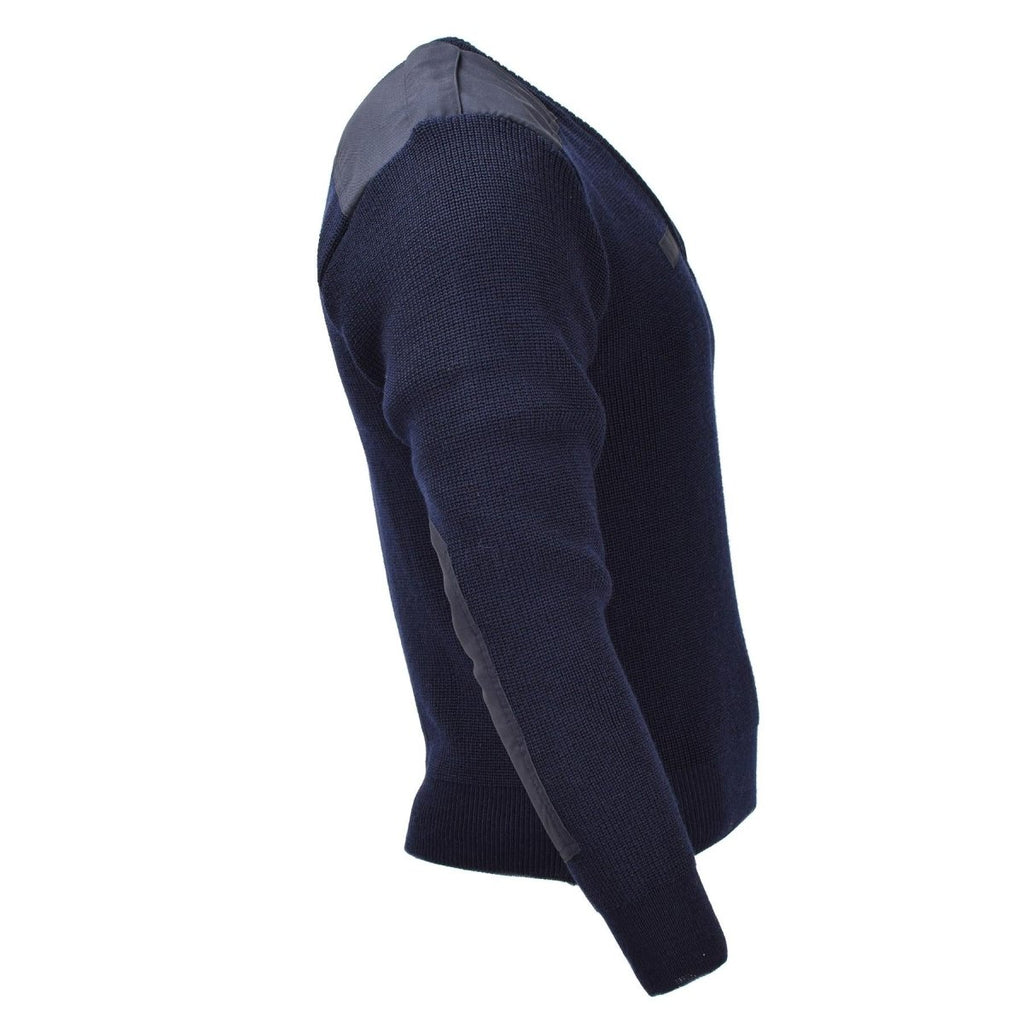 • The military blue sweater features a classic pullover design, providing both comfort and practicality. The ribbed V-neck, cuffs, and waistline ensure a snug fit, adding a polished touch to the sweater. Reinforced shoulders and elbows increase durability, ensuring the sweater holds up to daily wear.