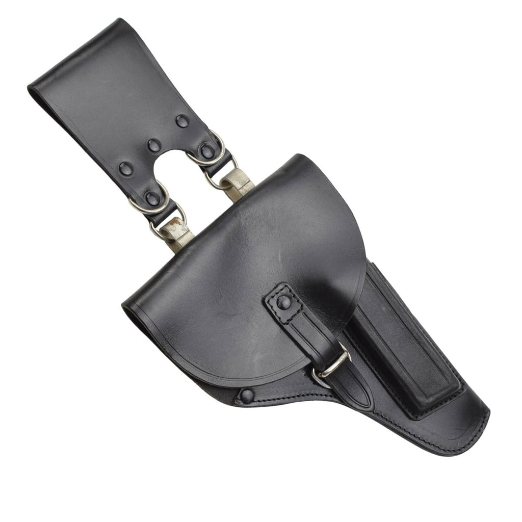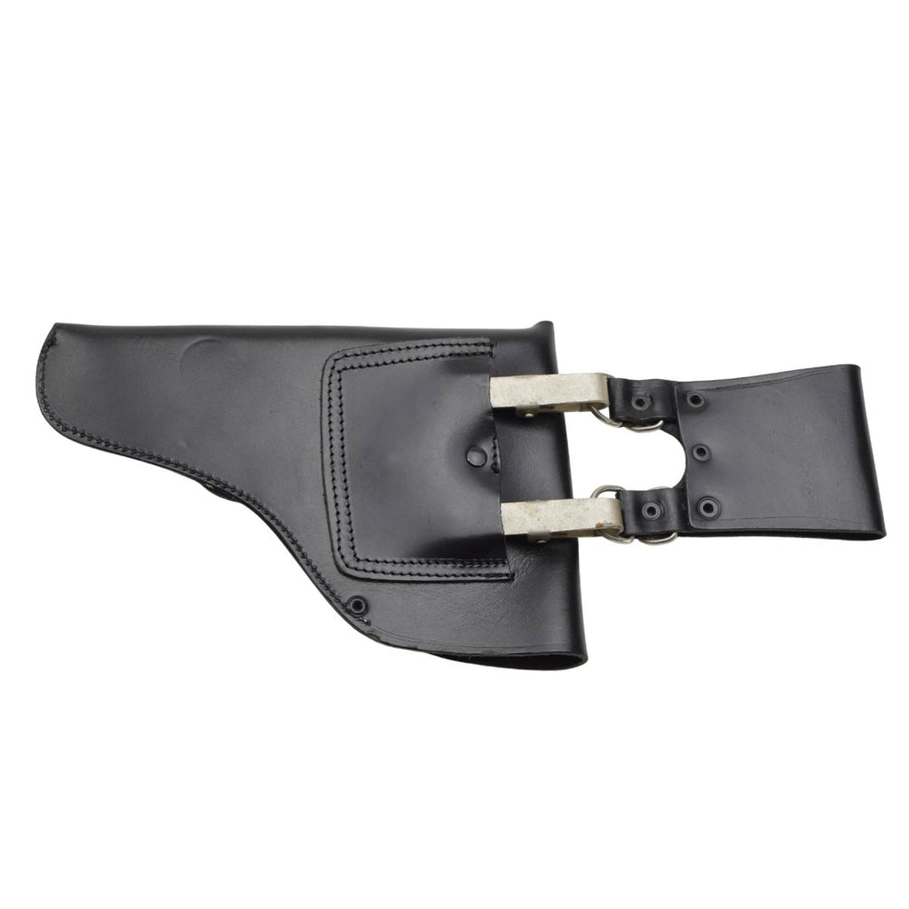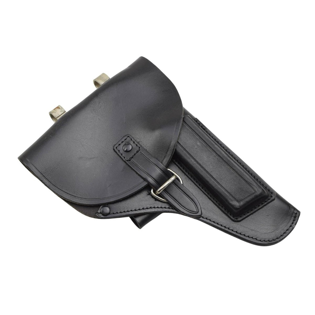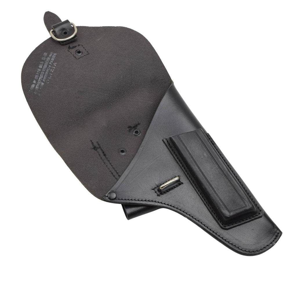 This is an authentic military pistol holster used by the Italian armed forces. Made of durable, high-quality black leather with reinforced stitching and secure buckle closure. The metal belt loops allow for stable and comfortable carrying. Designed for right-handed users. A great choice for collectors, reenactors, or functional use with classic sidearms.