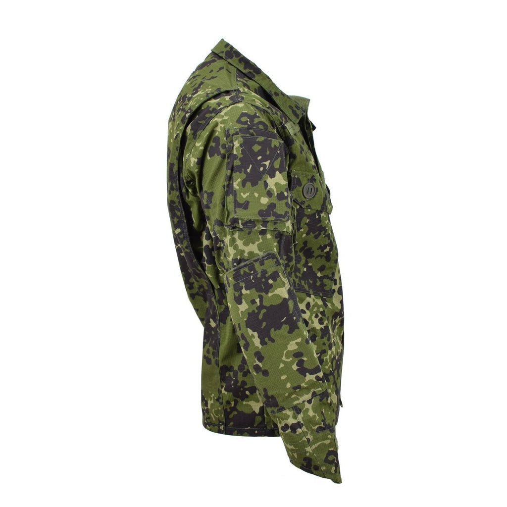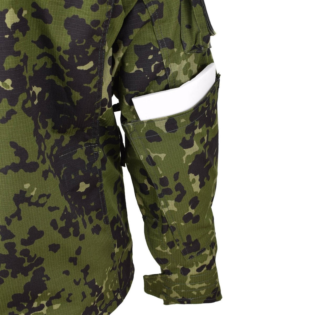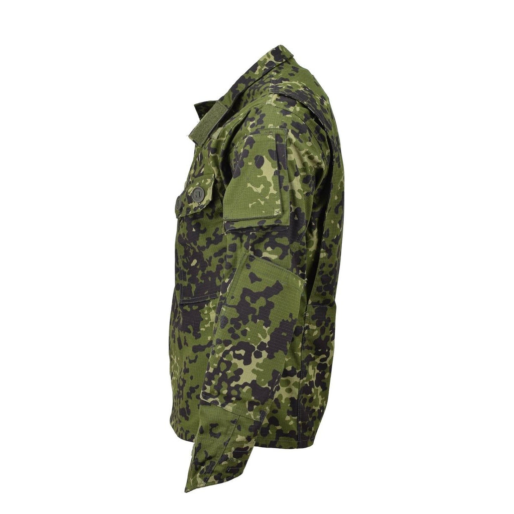 - First, the M84 combat shirt features a distinctive Danish military camouflage pattern. This pattern enhances its utility in various outdoor activities such as hunting, hiking, and camping. Additionally, the buttoned front allows for easy wearing and removal, while the reinforced elbows offer extra durability and protection.